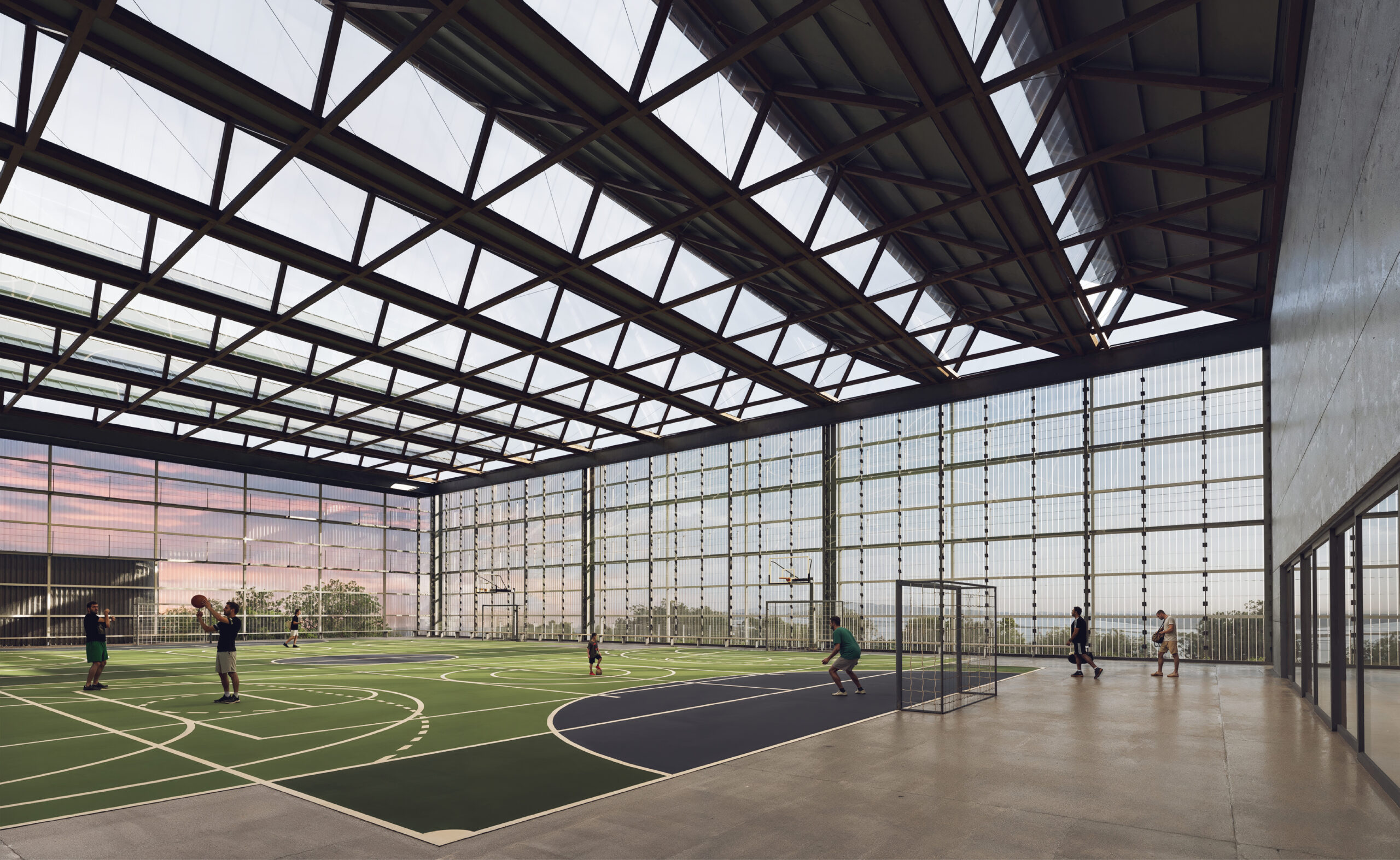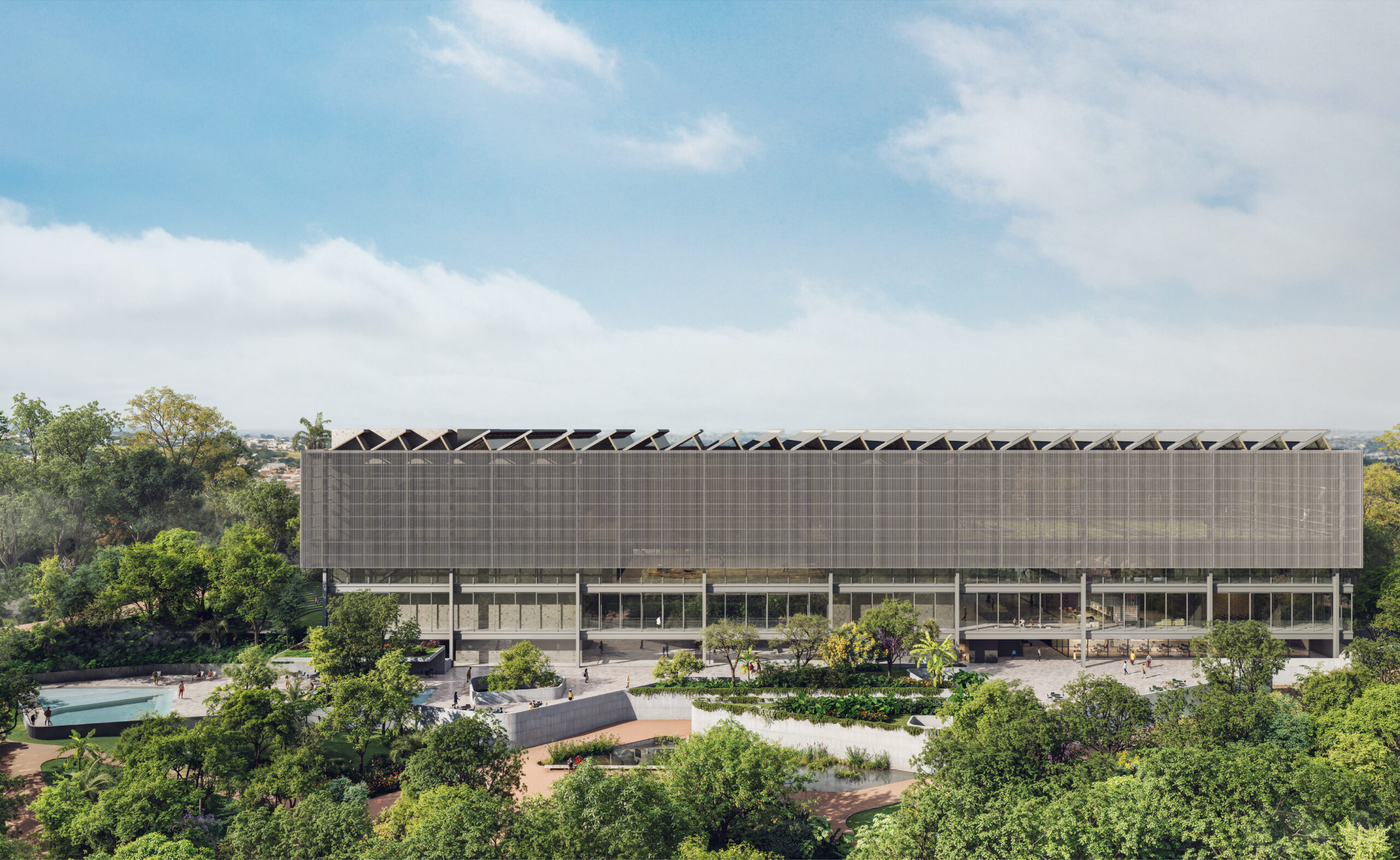 A cobertura contínua iluminante terá estrutura de madeira lamelada e colada, totalmente industrializada e certificada. Um conjunto de peças delgadas de madeira conforma uma estrutura espacial com sheds de abertura à face sul, garantindo vasta iluminação, sem incidência de calor, com ventilação permanente onde desejável. Toda essa cobertura funciona como uma máquina de captação de água doce e produção de energia elétrica a partir do sol.