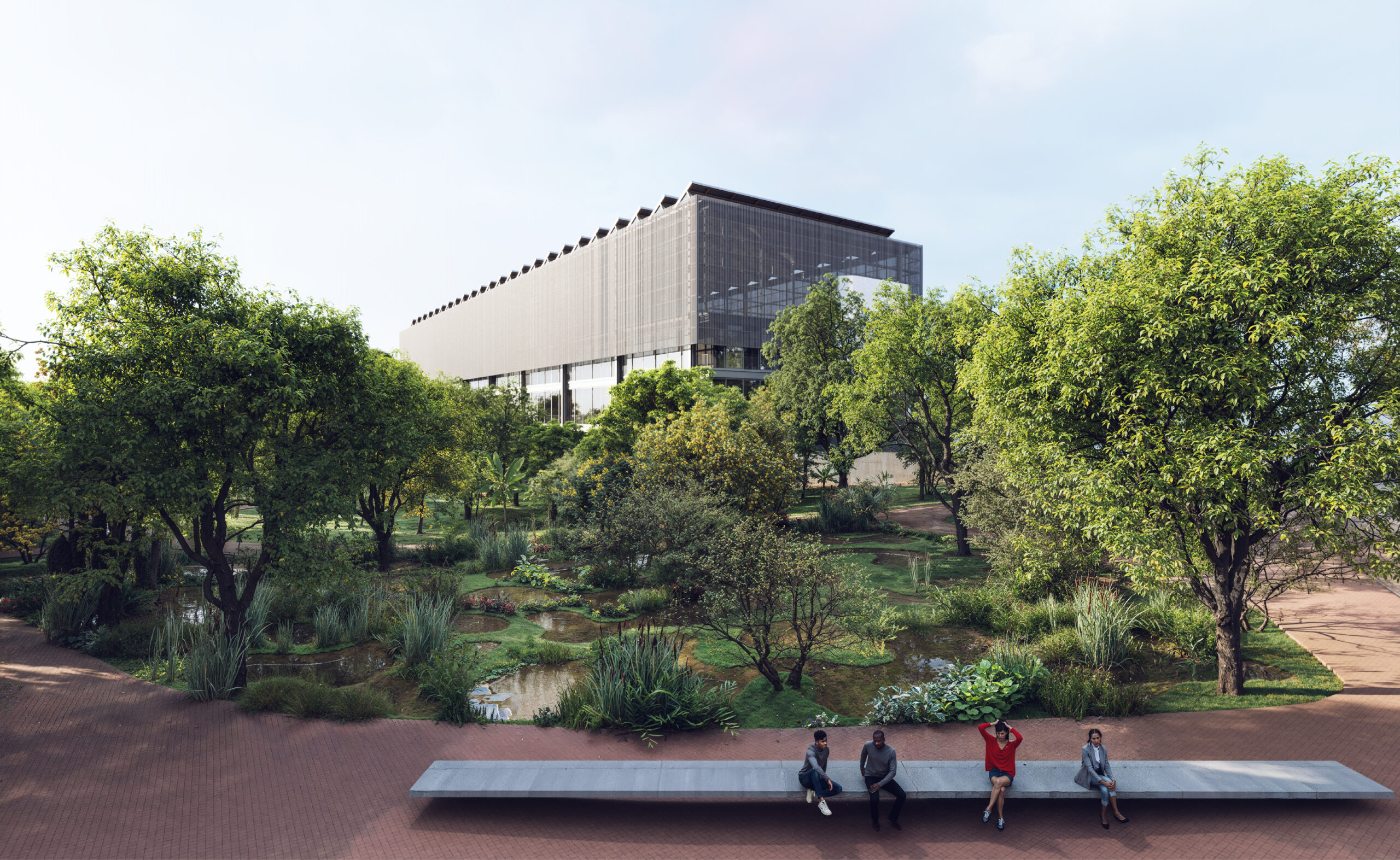 A conservação de 88% das árvores existentes se integra ao paisagismo pensado como ferramenta de gestão ambiental, na criação de ilhas de conservação de biodiversidade vegetal, nos arranjos florísticos e métodos de ajardinamento propostos com o objetivo da ecogênese.