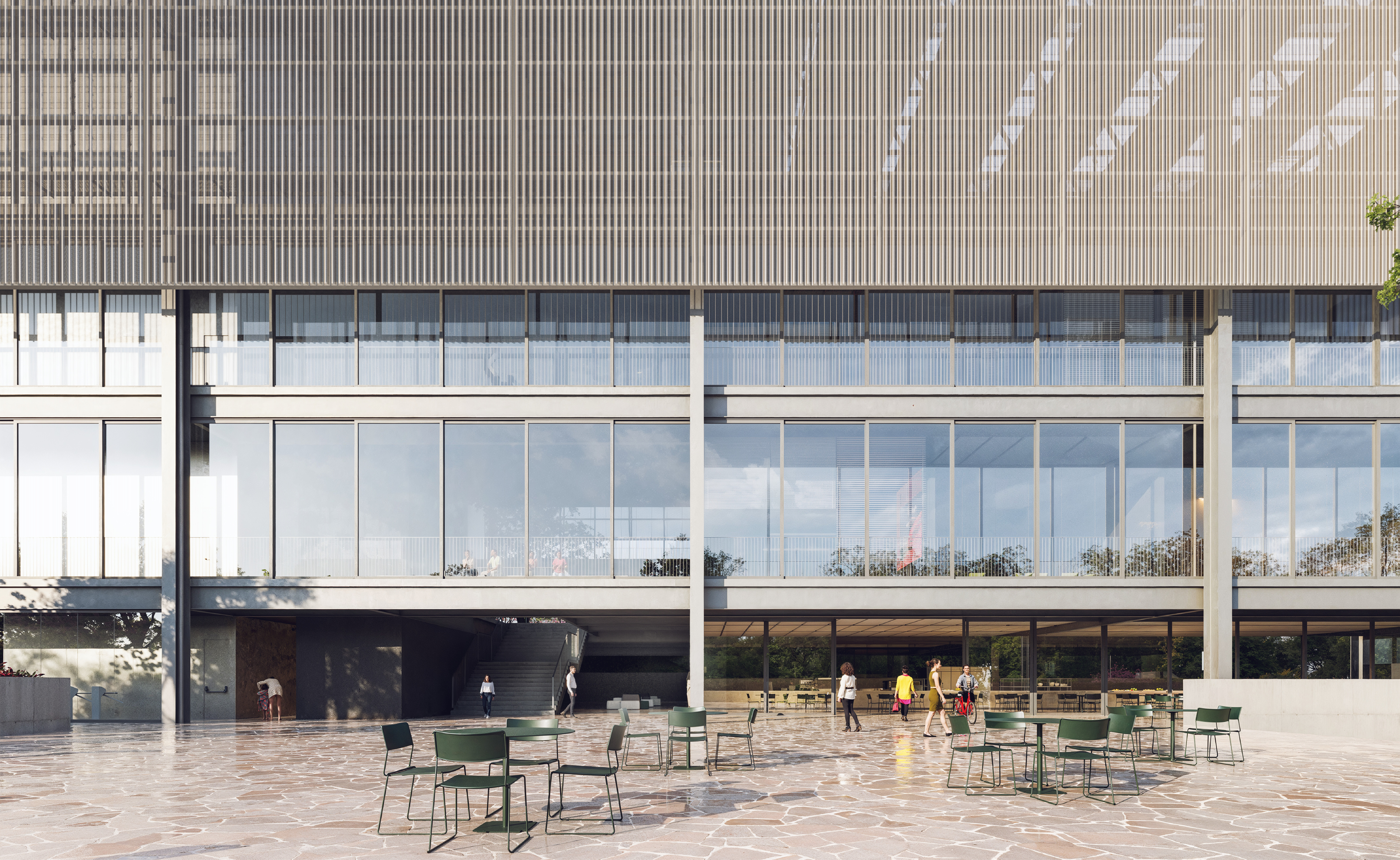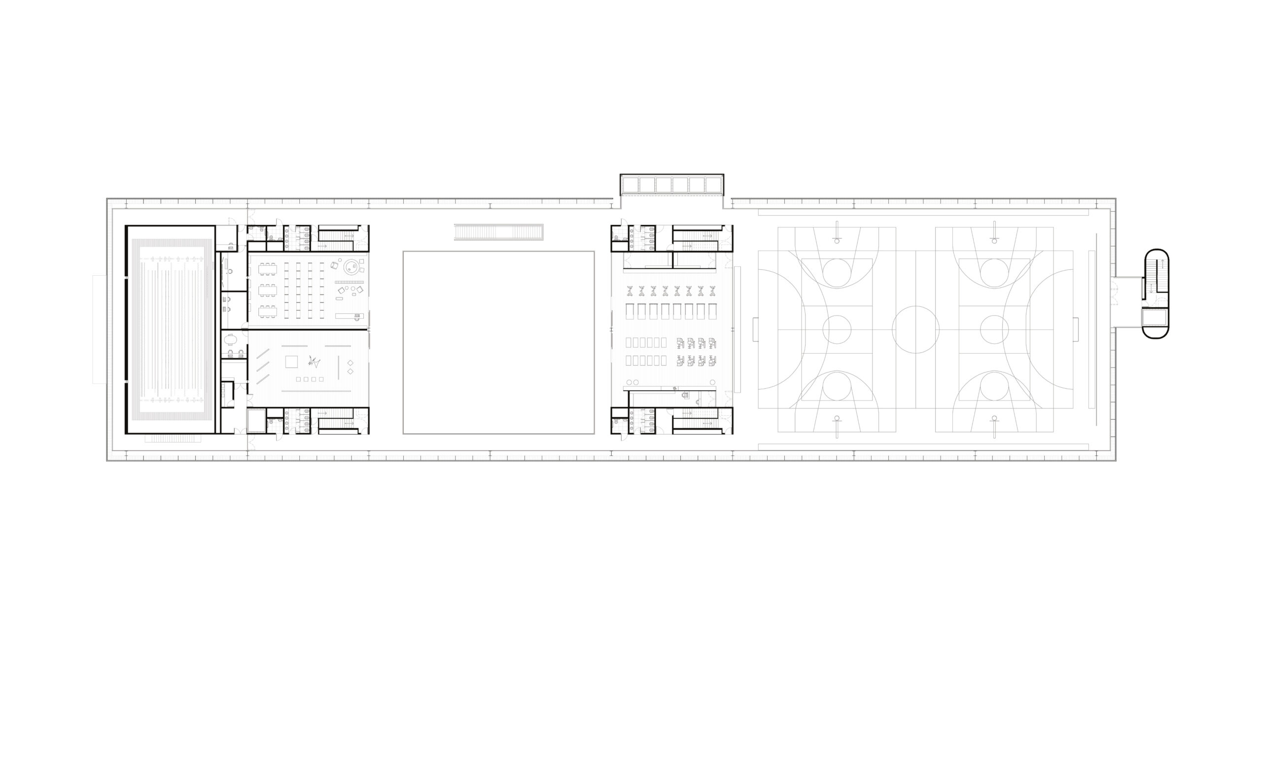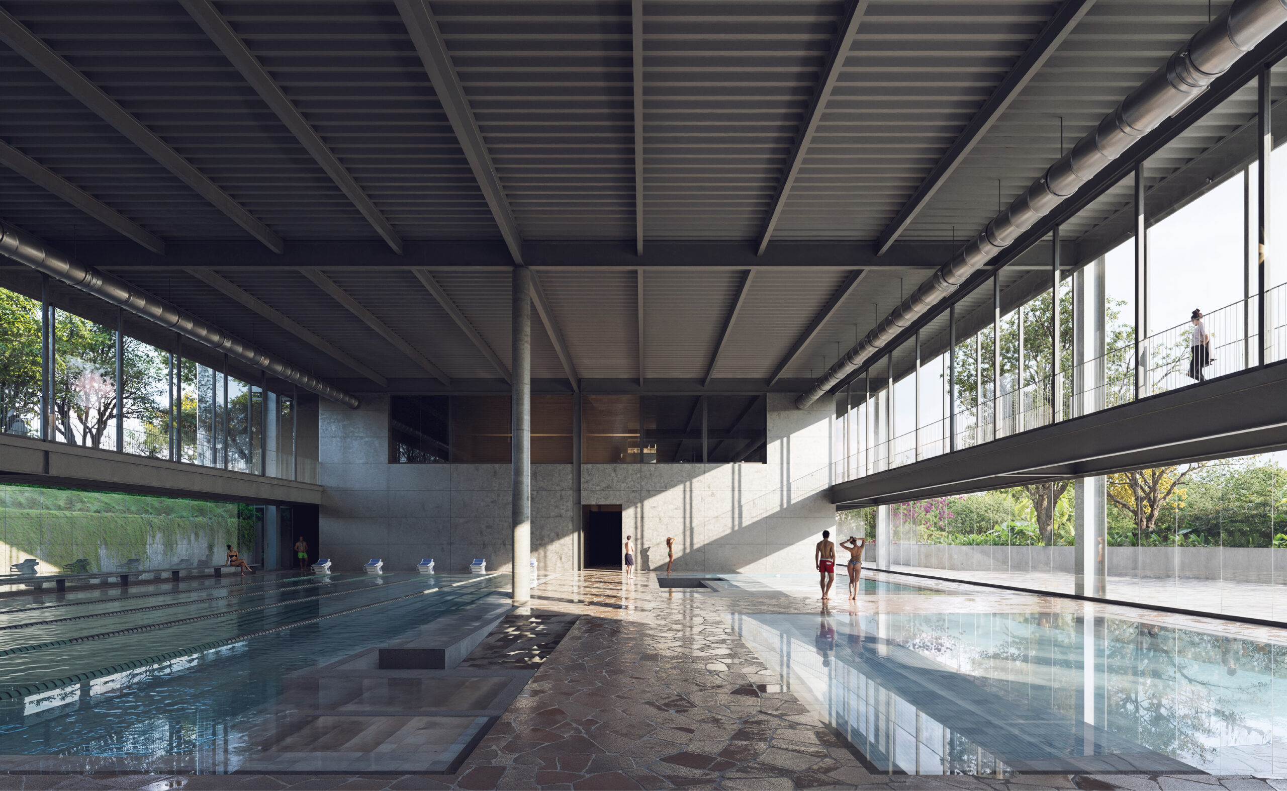 Os espaços sobrepostos destinados à Convivência e às Piscinas formam o coração desse projeto. Estabelecem relações visuais com a rua e com o parque, constroem a mediação e animam ambos. Desde a cidade, se percebem as atividades do centro aquático, bem como o que se passa na Convivência. O edifício se torna um mirante e referência na cidade.