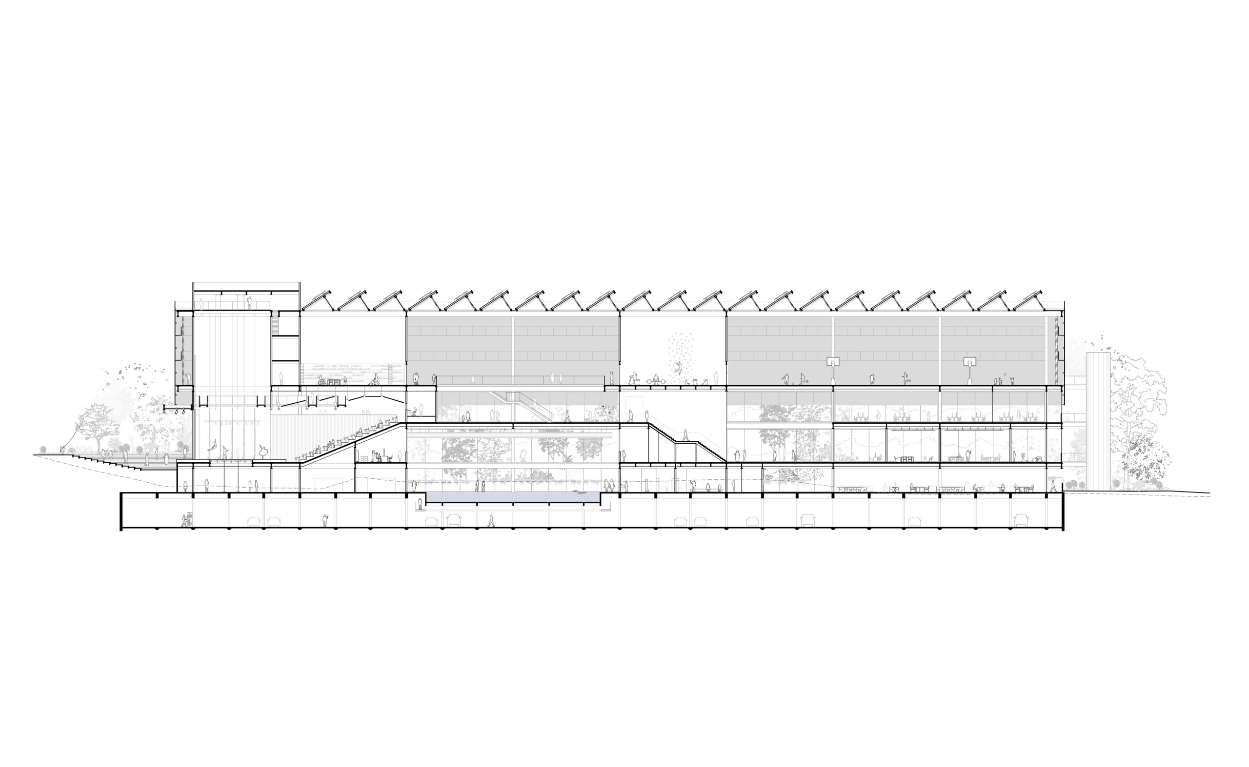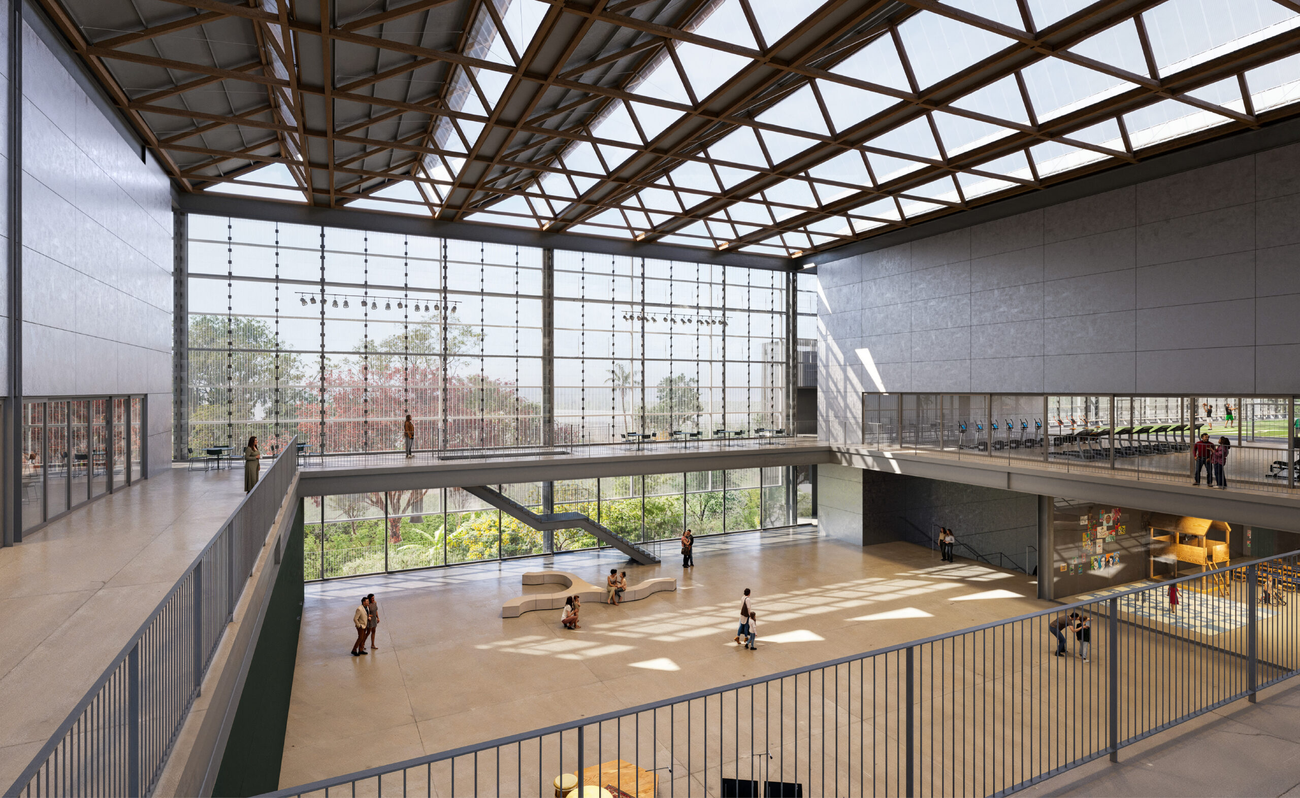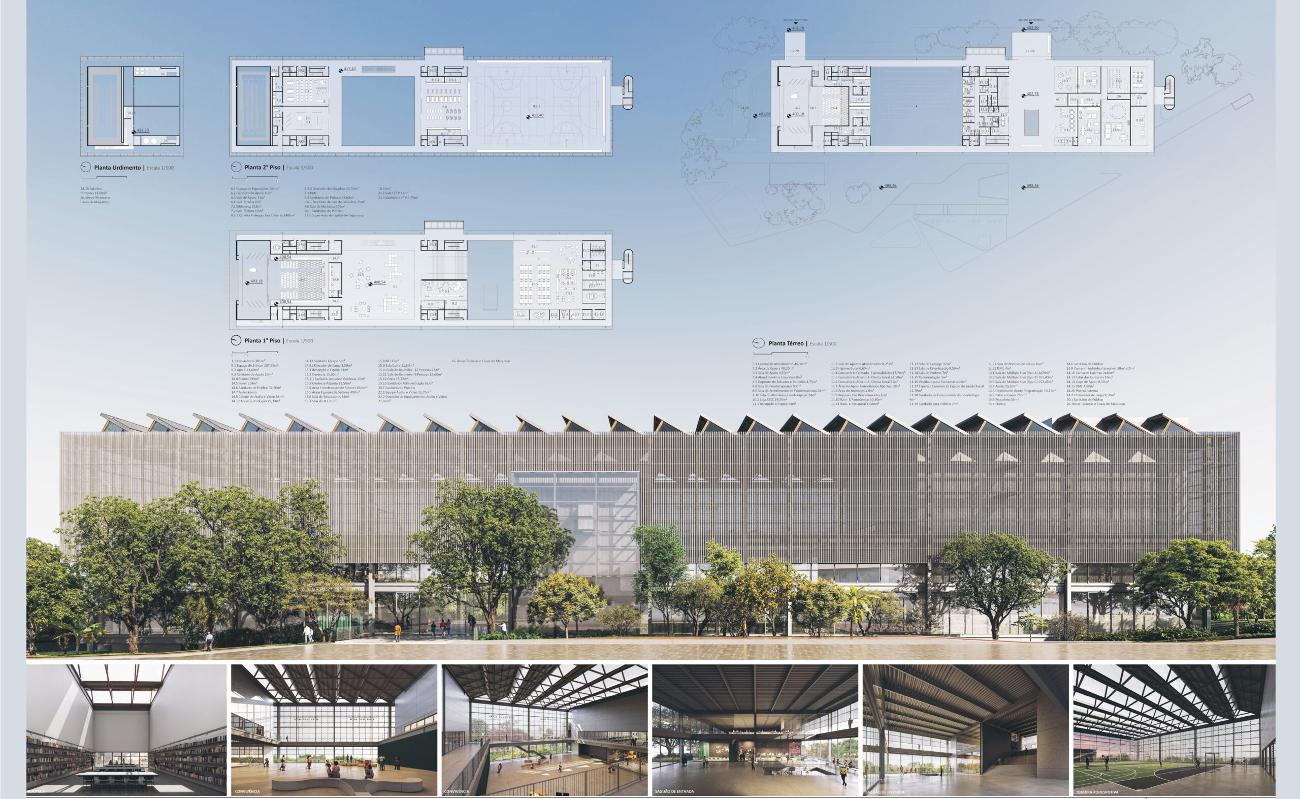 A Convivência conecta muitos usos e foi pensada como espaço múltiplo, um lugar central de acolhimento e tranquilidade. Por isso não se localiza na entrada, não se reduz a um local de passagem. Esse átrio será equipado para permitir pequenas apresentações, atividades informais e descanso: uma grande praça coberta e sombreada. Funciona como extensão do espaço Infanto-juvenil e como Foyer do teatro. Por aí também pode-se chegar à Biblioteca, Exposições, Academia de ginástica e Quadras poliesportivas. Esporte, cultura, lazer e educação confluem para esse ambiente de interação. Todos os programas dos andares superiores estão sob o céu, banhados de luz indireta. Muitos ambientes necessitam pés direitos altos. Deste espaço central também se faz o acesso, por pontes sobre o saguão de entrada, à Administração, espaço de trabalho protegido da agitação.