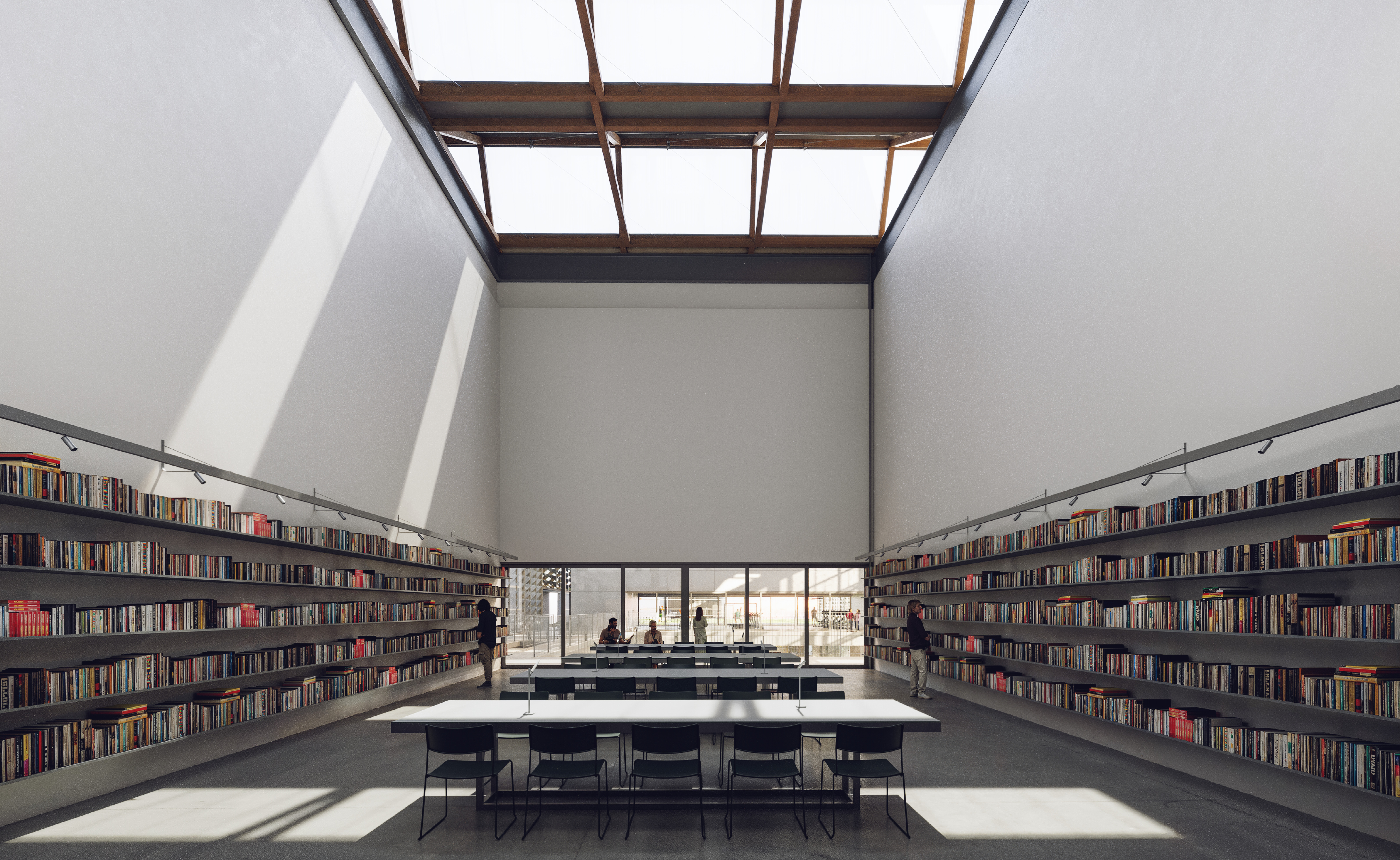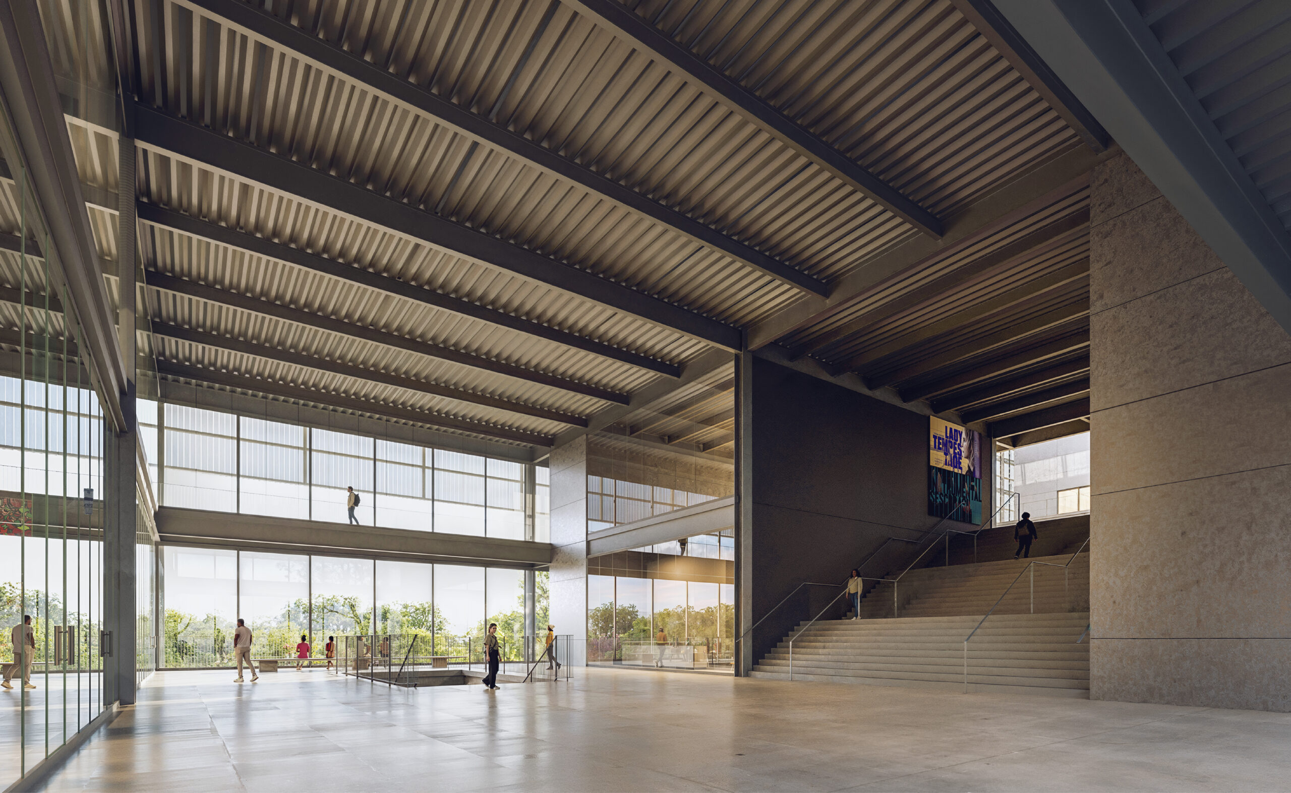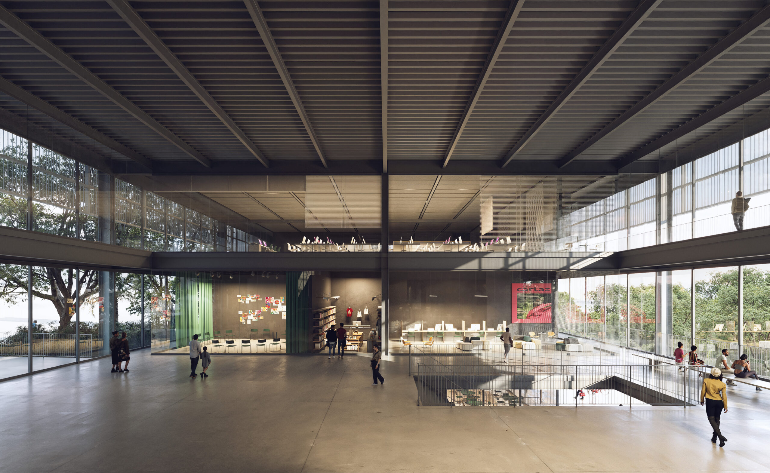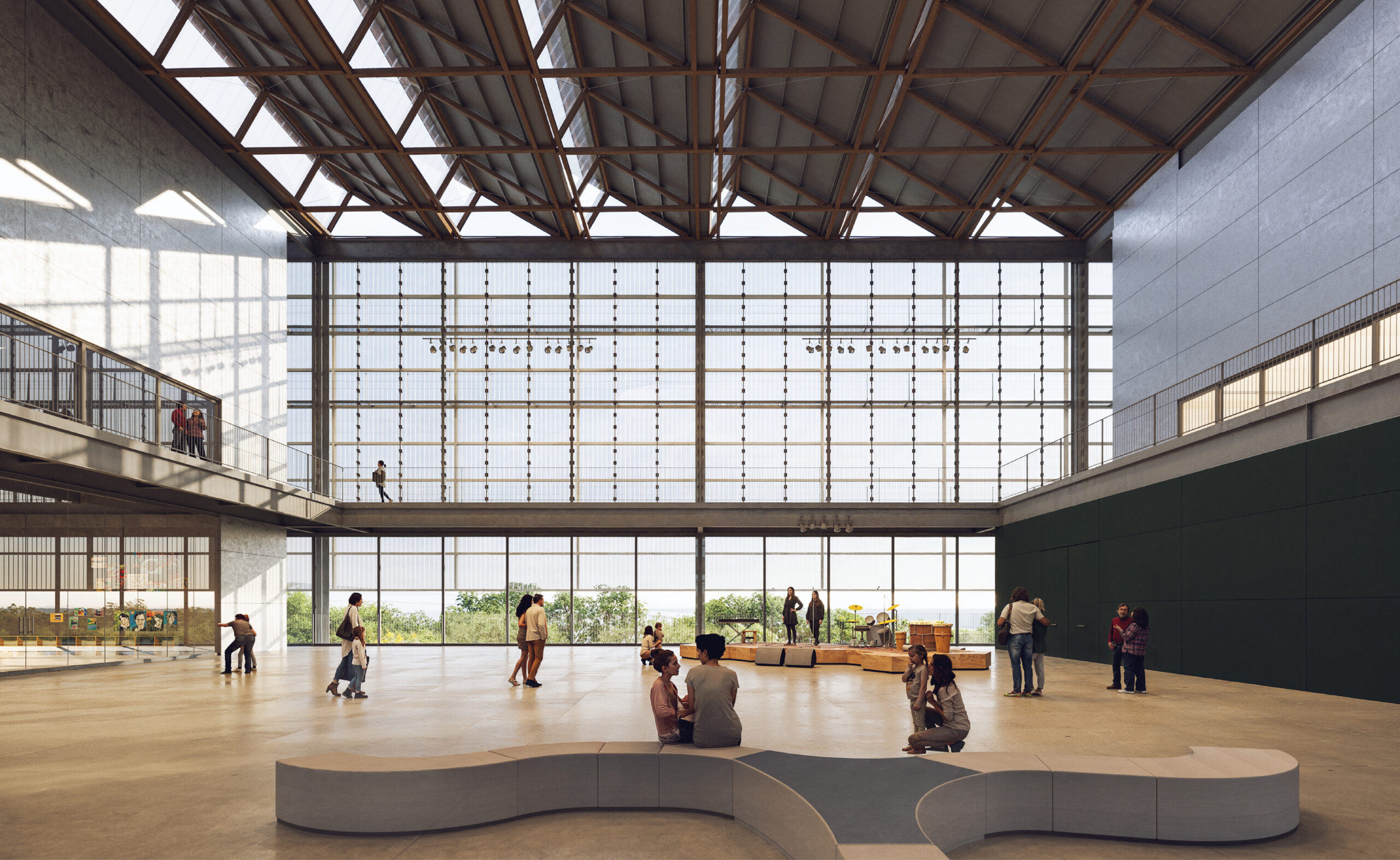 A Convivência conecta muitos usos e foi pensada como espaço múltiplo, um lugar central de acolhimento e tranquilidade. Por isso não se localiza na entrada, não se reduz a um local de passagem. Esse átrio será equipado para permitir pequenas apresentações, atividades informais e descanso: uma grande praça coberta e sombreada. Funciona como extensão do espaço Infanto-juvenil e como Foyer do teatro. Por aí também pode-se chegar à Biblioteca, Exposições, Academia de ginástica e Quadras poliesportivas. Esporte, cultura, lazer e educação confluem para esse ambiente de interação. Todos os programas dos andares superiores estão sob o céu, banhados de luz indireta. Muitos ambientes necessitam pés direitos altos. Deste espaço central também se faz o acesso, por pontes sobre o saguão de entrada, à Administração, espaço de trabalho protegido da agitação.