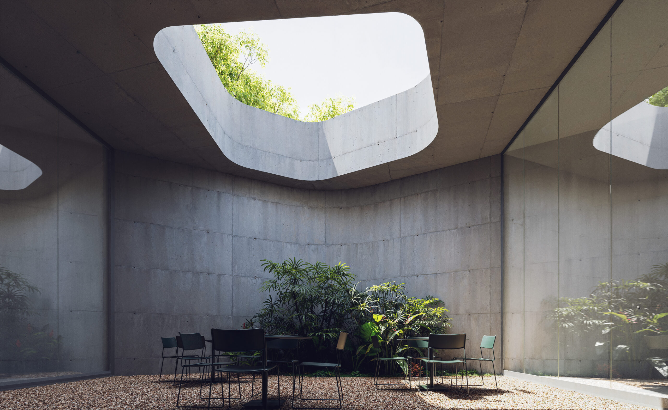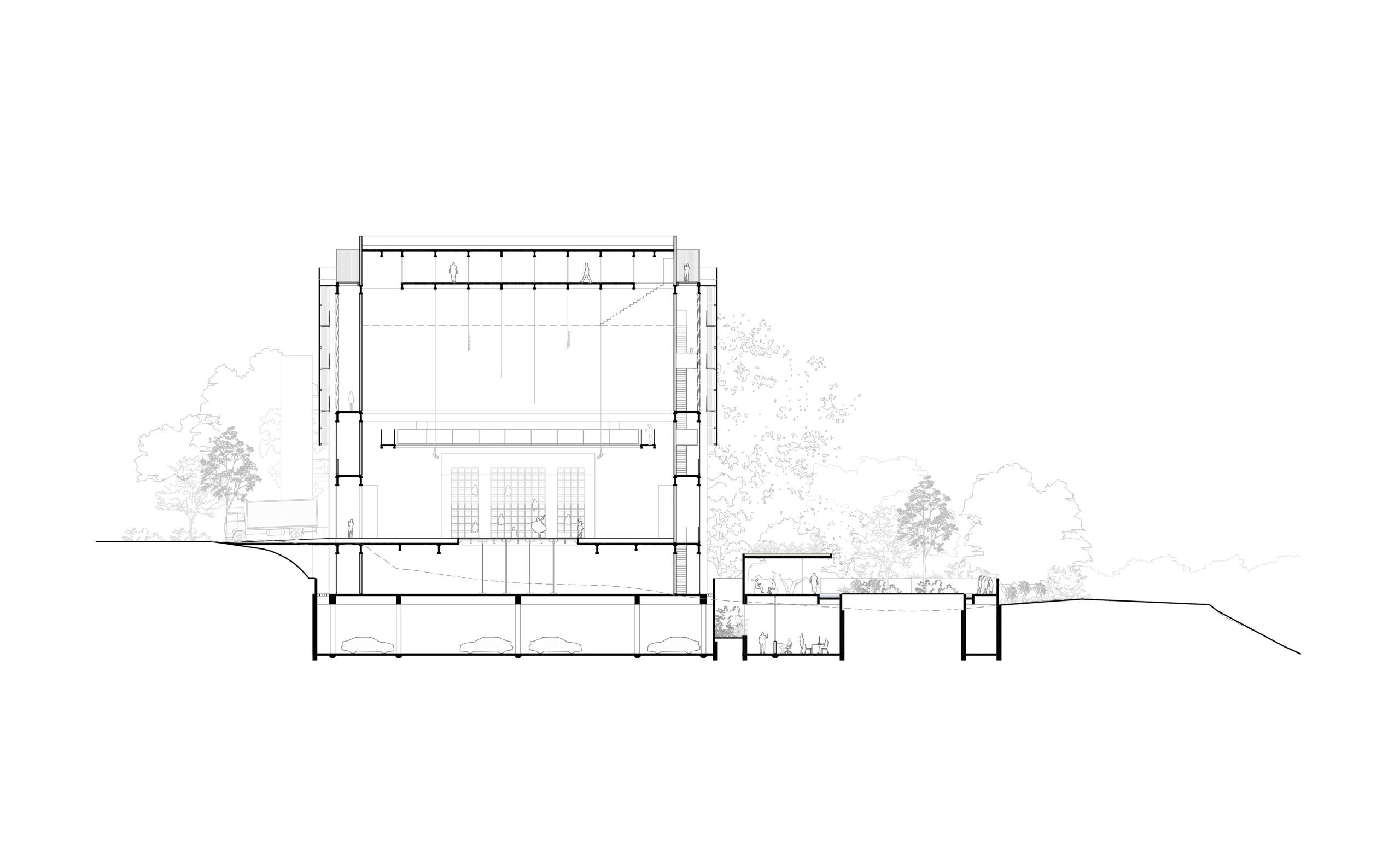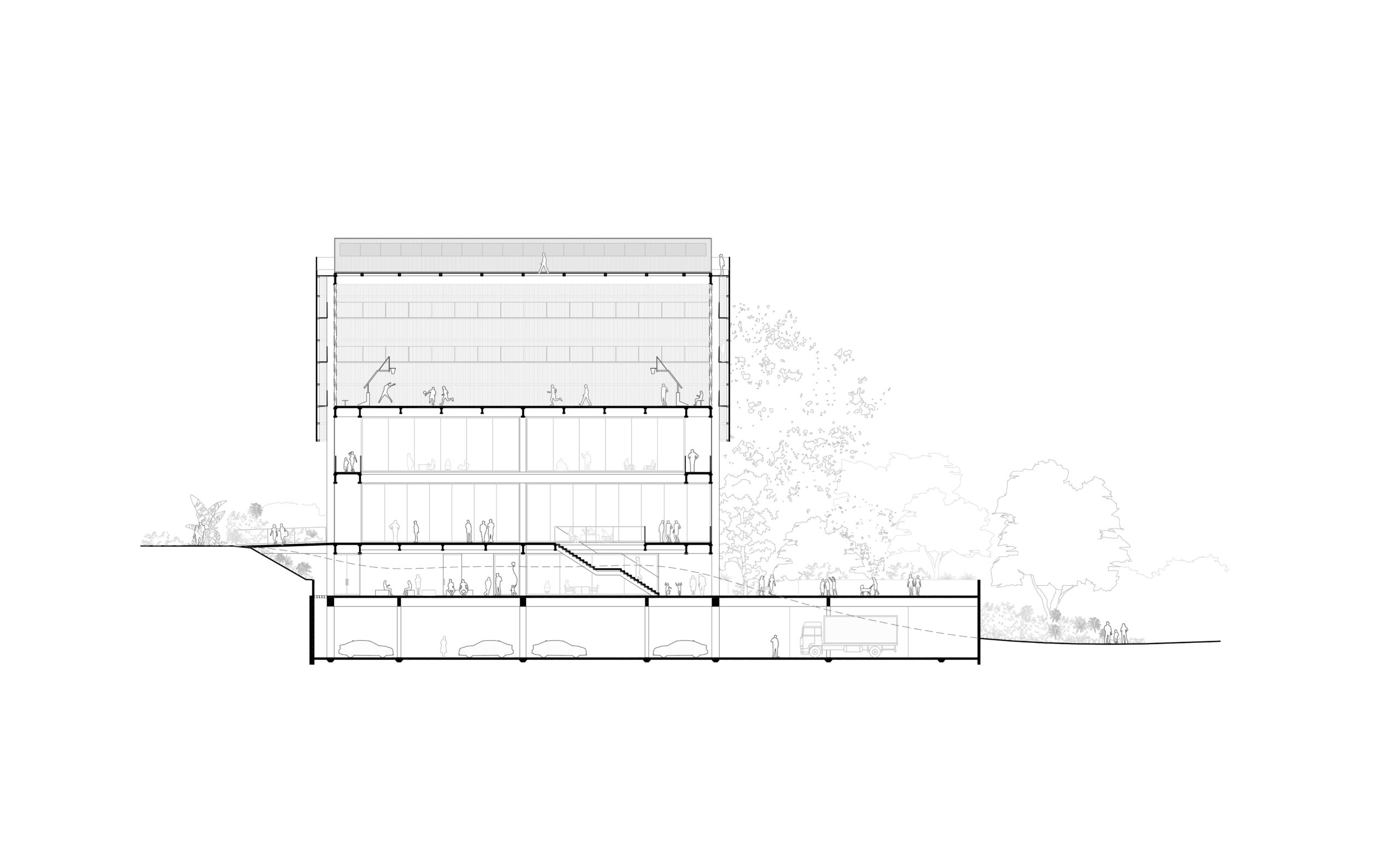O subsolo em concreto concentra todo o Estacionamento, Doca e Áreas técnicas. As áreas de trabalho e descanso como o Mesa Brasil, Almoxarifados e o Bem Viver se abrem a pátios ajardinados que garantem iluminação e ventilação naturais aos funcionários e trabalhadores locais. O volume aflora como pedra no parque e configura praças e solários.