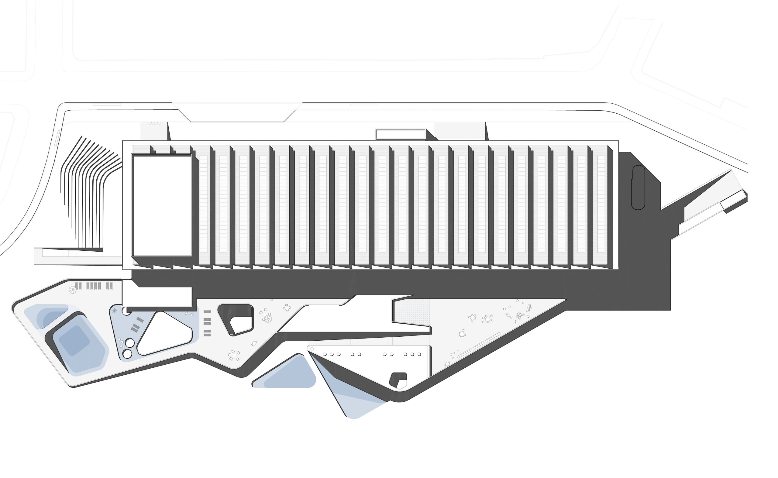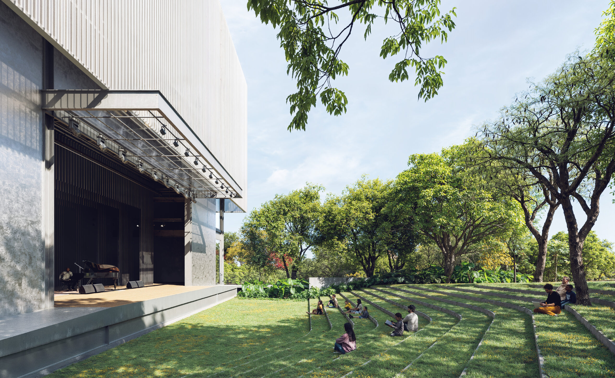 Esse bloco concentrado aproveita os diferentes níveis do terreno para acomodar os programas solicitados: o teatro ao ar livre se encaixa à topografia junto à rua Floriano Borges, formando uma arquibancada natural em meio às árvores existentes e um acesso de serviços liga diretamente o palco à rua; a entrada do estacionamento se localiza do lado oposto, facilitando o acesso de carros e caminhões ao subsolo por uma rampa; e o acesso principal de público se faz pela rua Alberto Peters. O saguão de entrada se estende até o exterior como convite às pessoas para ingressar. A relação da edificação com o parque se dá pela mediação da praça: um piso que se esparrama pelos jardins, entremeando jardins novos, existentes, e águas para diversas experiências: jatos, tanques, prainhas, chuveiros. A umidade como experiência da nova unidade.