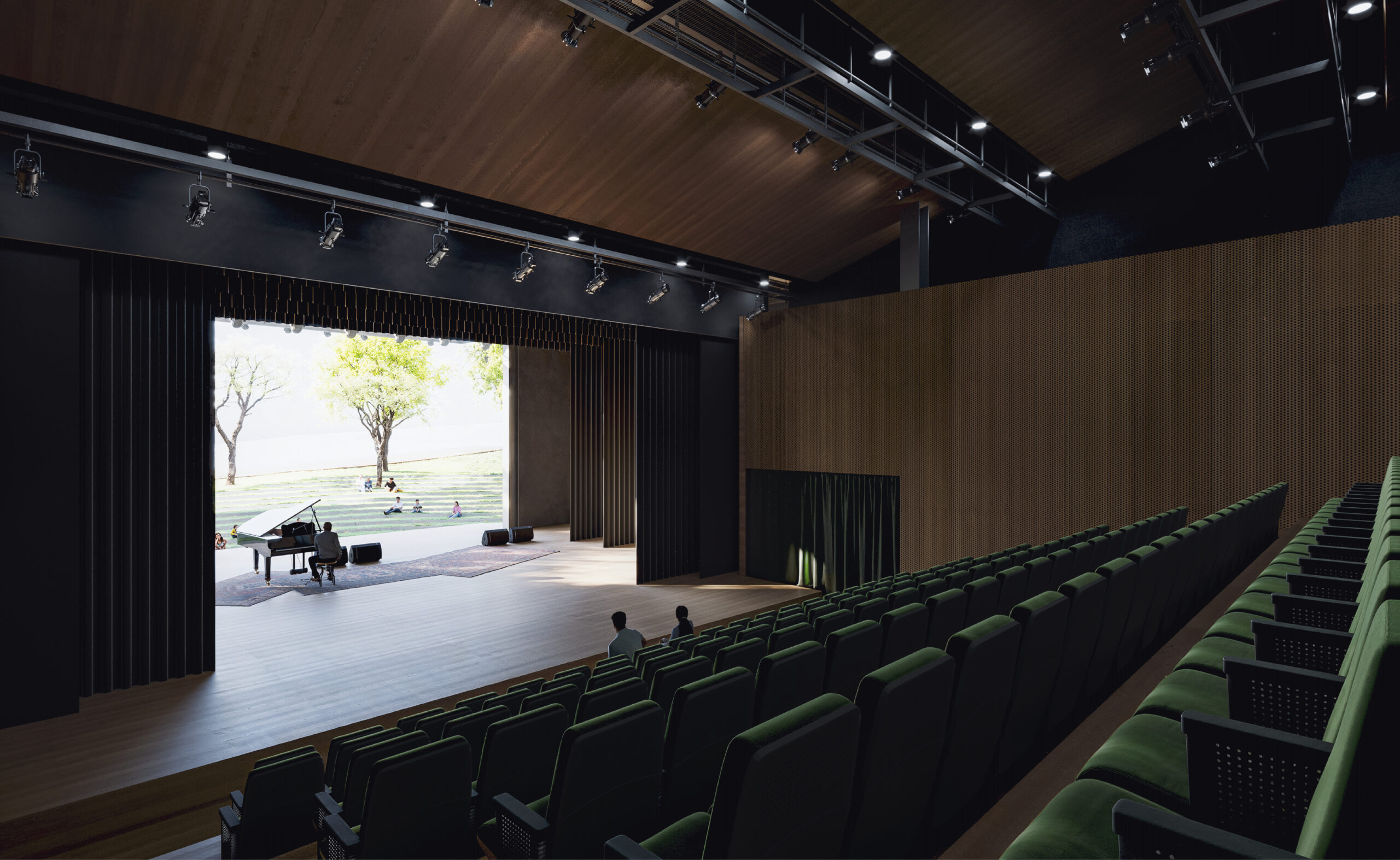 O Teatro foi pensado como uma sala de cena frontal, configuração mais adequada a cidades e centros culturais que recebem montagens variadas e pré-determinadas, peças, música ou dança. A facilidade nas montagens, economia de recursos, qualidades cênicas e acústicas que uma sala como essa promove, indicam sua escolha. O Teatro aproveita a altura total do edifício para abrigar a caixa de palco, possui elevador de carga ligado à doca e acesso de serviços direto da rua.