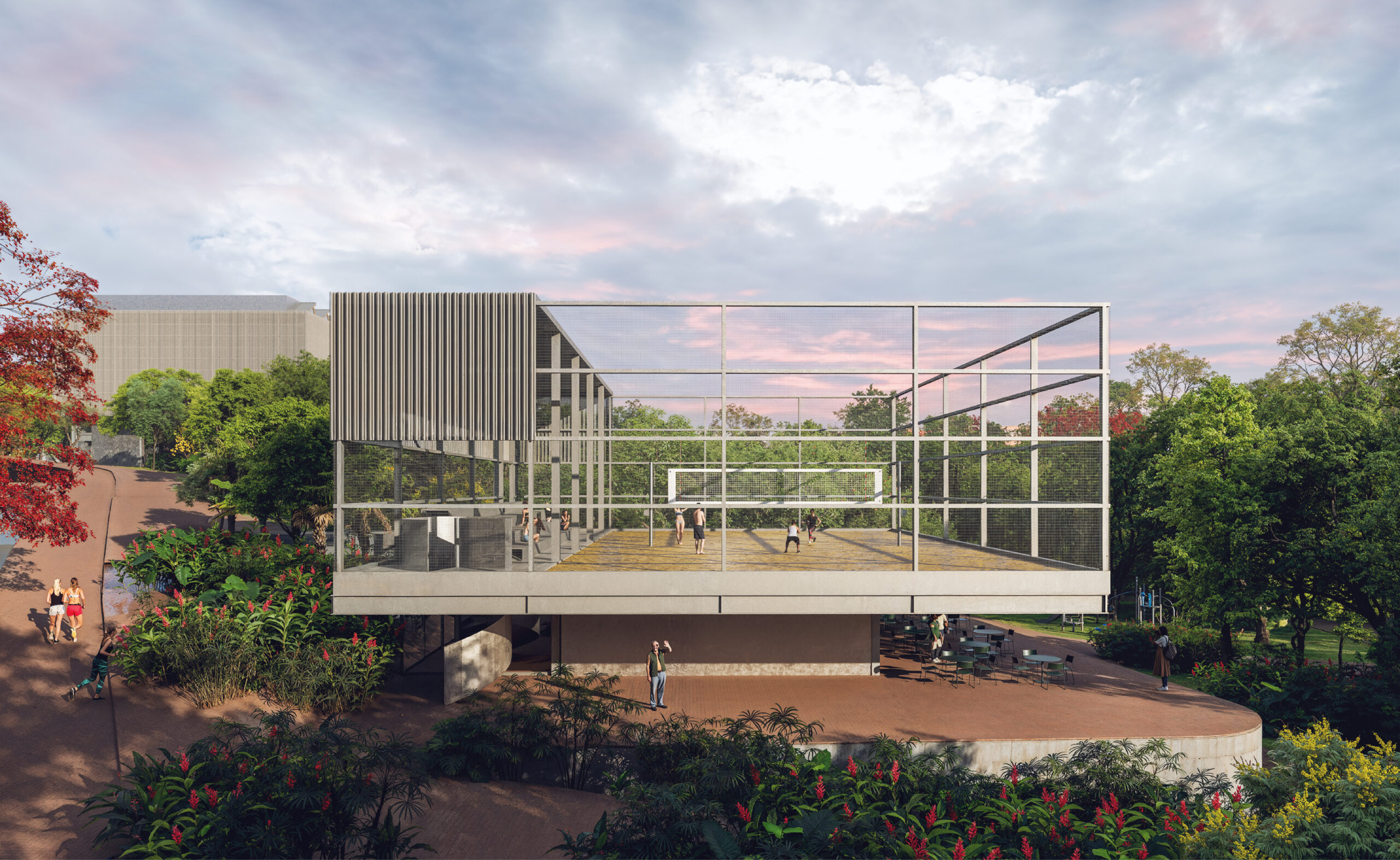 A estratégia de concentrar programas para preservar árvores foi utilizada também para a quadra de areia, arquibancada, quiosque com sorveteria e varanda, que foram propostos no interior do parque, aproveitando parte da clareira da antiga quadra esportiva externa. Abriga ainda o espaço destinado ao Centro de Educação Ambiental, junto da horta agroecológica, compostagem e área de experimentação agroflorestal. Outros programas como redários, pique-niques, ginástica ao ar livre e brinquedos para crianças estarão esparramados pelo parque, protegidos pelo sombreamento das árvores existentes.
