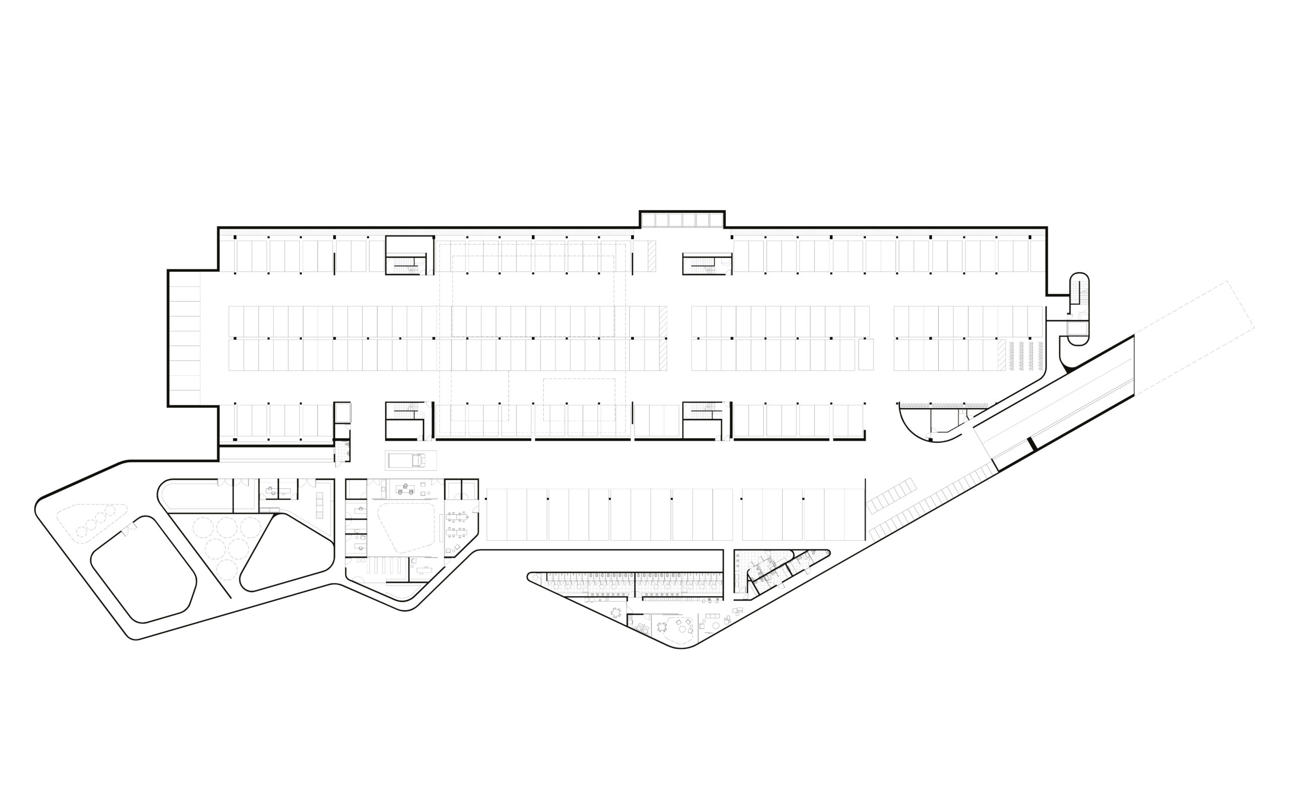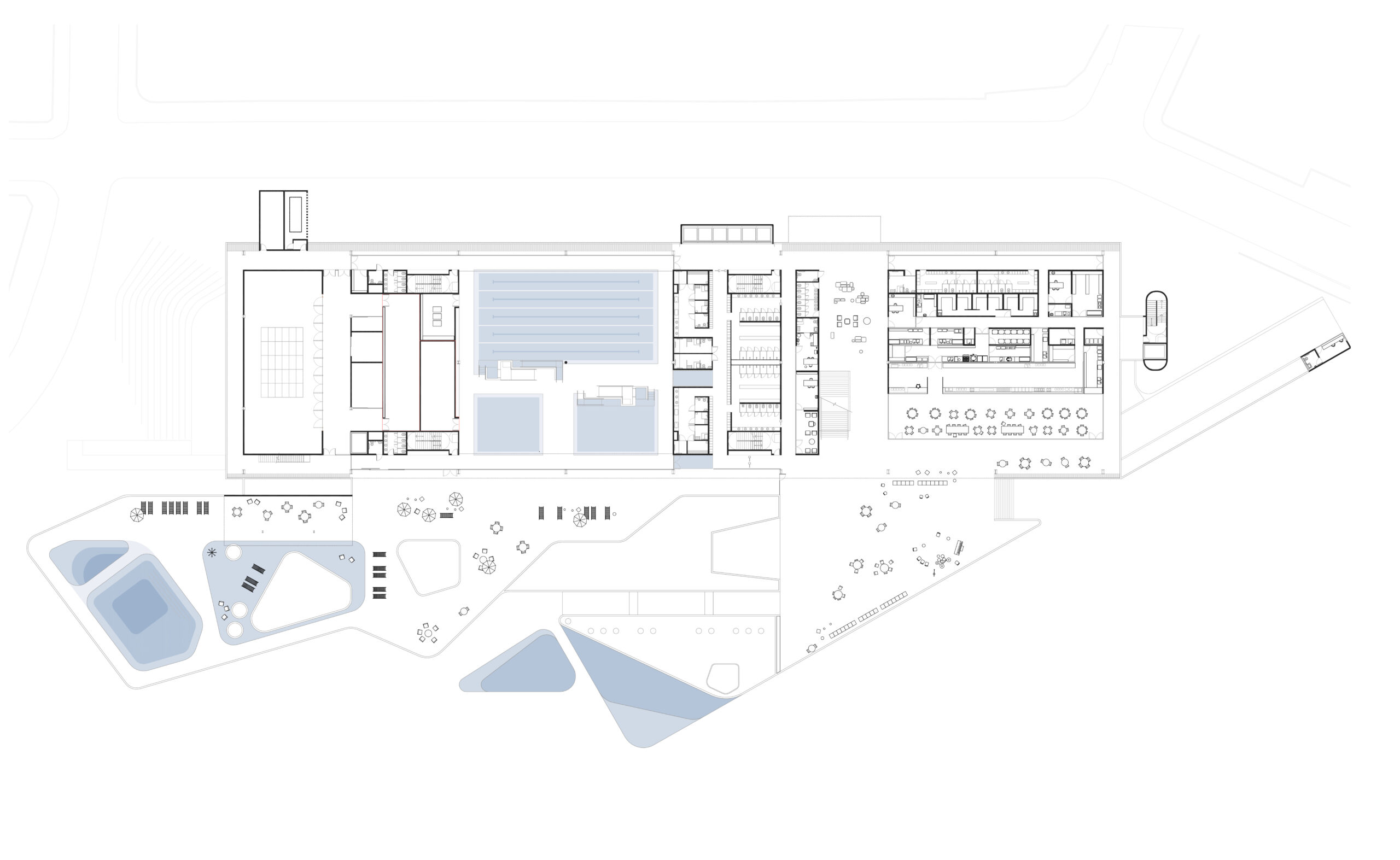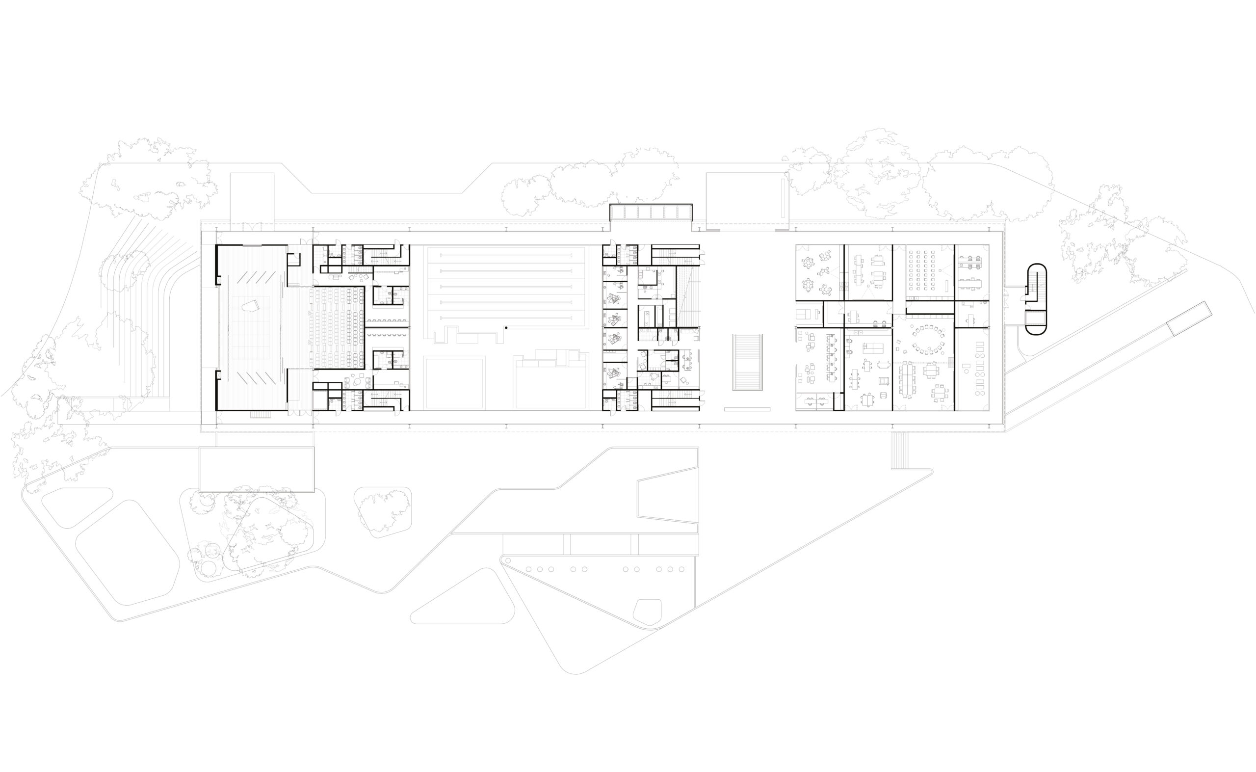 A premissa fundamental foi ocupar a clareira remanescente da antiga construção, evitando retirada da arborização do parque. O edifício principal concentra os usos em um bloco linear de 4 pavimentos e um subsolo, e abrigará as novas atividades, desenhado para não se espraiar sobre a vegetação.