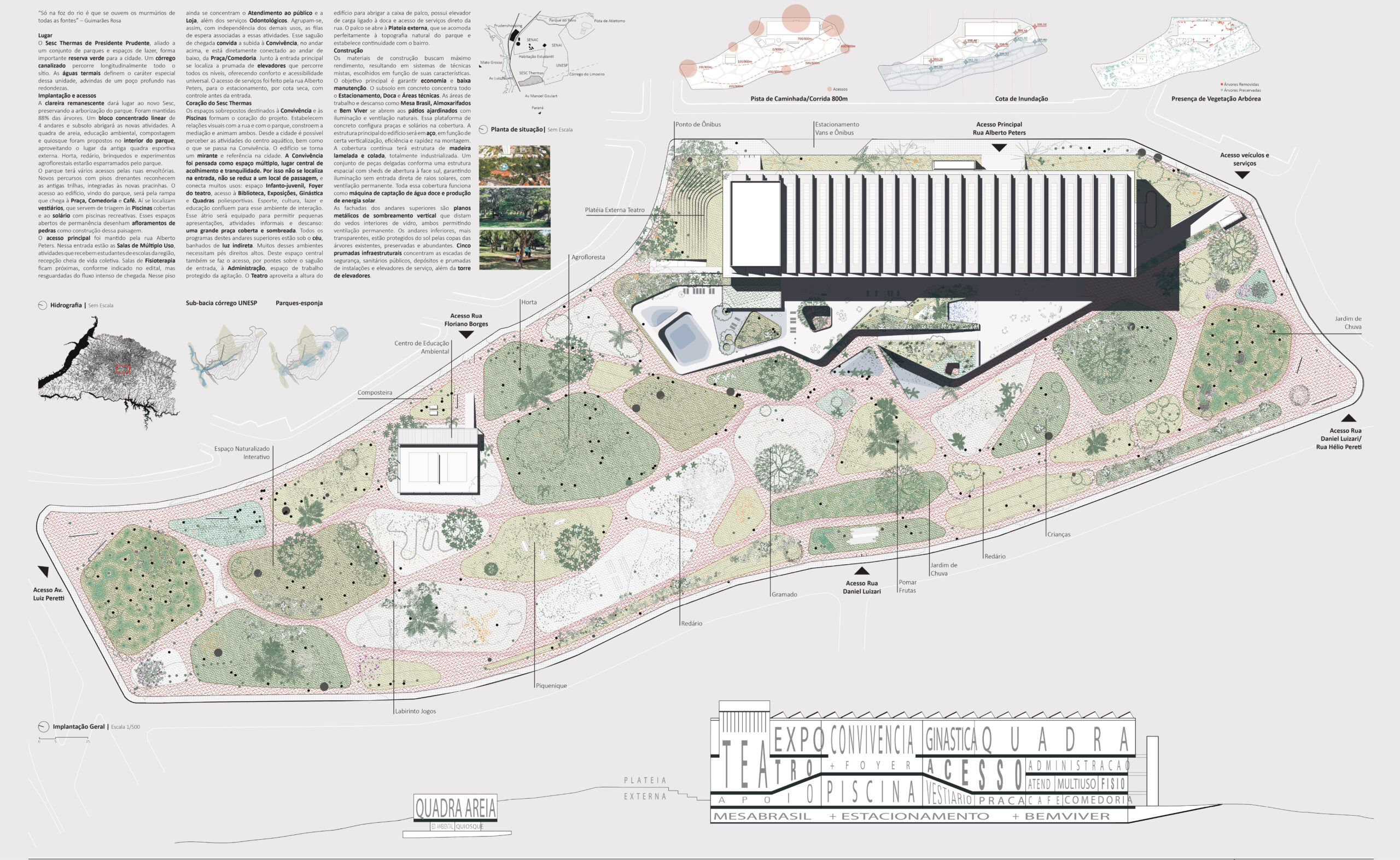 Presidente Prudente se localiza em região com predominância de Mata Atlântica com transição para o Cerrado. O estudo das pré-existências ajardinadas e uma nova configuração cênica e micro ambiental guiou o projeto, integrando-se às águas, árvores existentes e procurando estabelecer relações com os remanescentes vegetacionais do bioma prevalente.