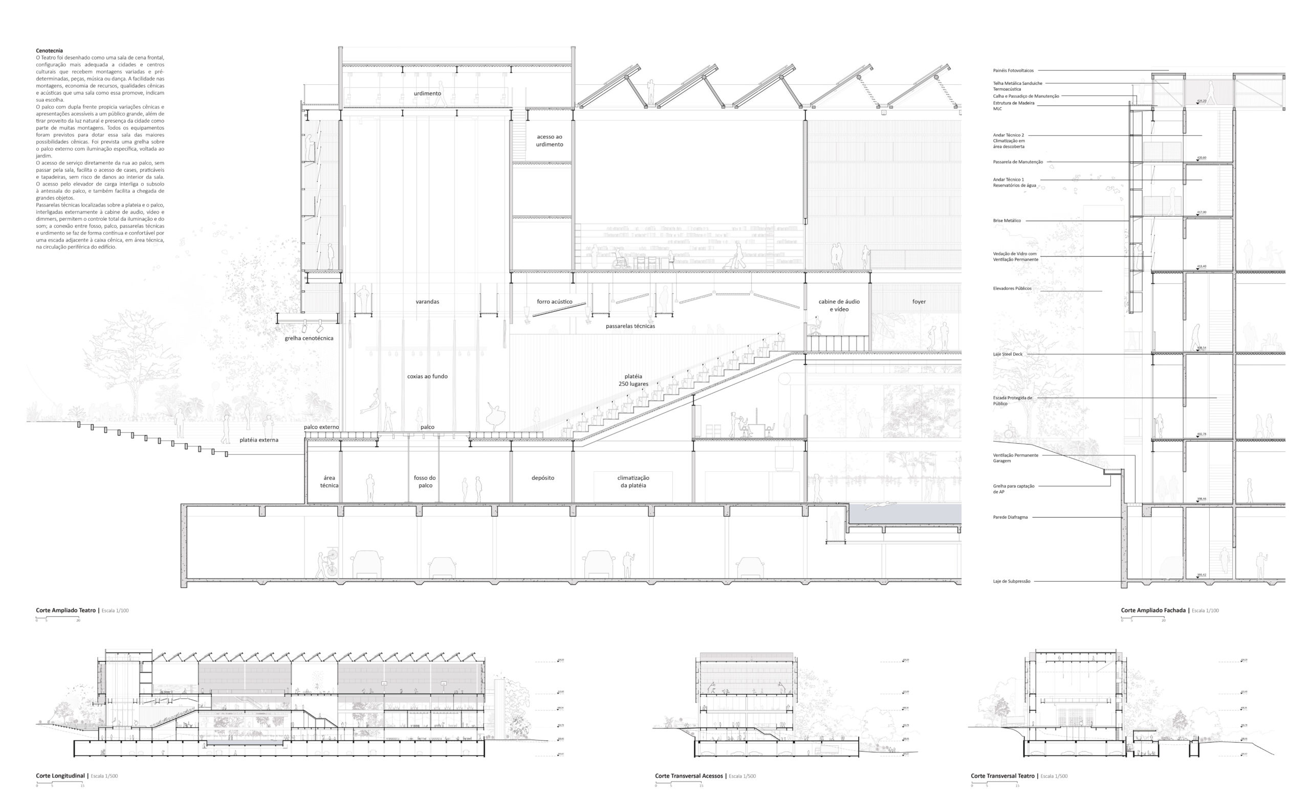Novos acessos ao parque foram acrescidos de pequenas praças, com bancos, painel de informações e sombras garantidas. Um alargamento das calçadas foi desenhado no ponto alto da plateia externa, ampliando a relação cênica com a cidade, imaginando que a rua possa ser parte do espetáculo.