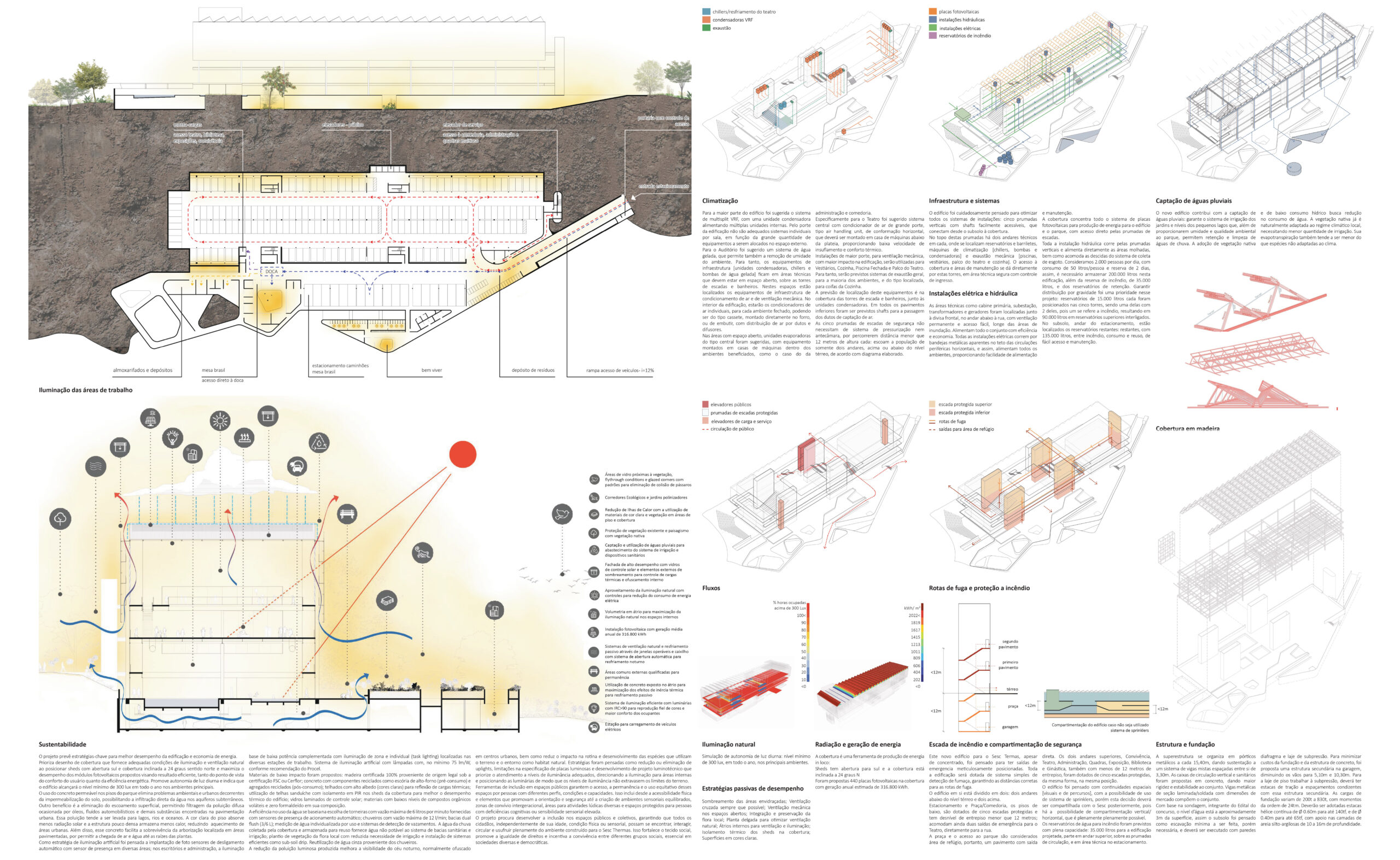 O projeto prevê estratégias-chave para melhor desempenho da edificação e economia de energia, prioriza desenho de cobertura que fornece adequadas condições de iluminação e ventilação natural ao posicionar sheds com abertura sul e cobertura inclinada a 24 graus sentido norte e maximiza o desempenho dos módulos fotovoltaicos propostos visando resultado eficiente, tanto do ponto de vista do conforto do usuário quanto da eficiência energética. Promove ainda autonomia de luz diurna e indica que o edifício alcançará o nível mínimo de 300 lux em todo o ano nos ambientes principais, além de estratégias de economia na iluminação artificial.